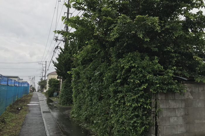 周囲にはたくさんの木々が生えており外からでは敷地内が見えない状態です。建物以外にこれらの木々や外壁及び井戸など全て解体撤去するという工事内容となります。